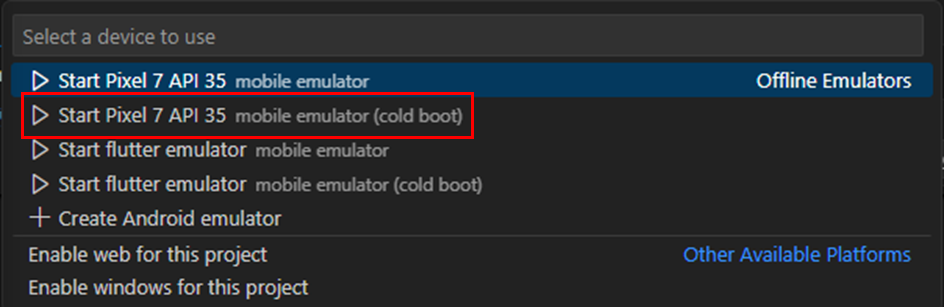 가능한 device 열어보면 똑같은 이름의 에뮬레이터로 기본/cool boot 이렇게 두 개가 있는데, cool boot 로 열면 된다.