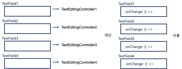 기존에 나는 textField 위젯으로 사용자에게 입력 값을 받는 작업을 하고 있었다. controller 를 사용하면 쉽게 작업이 가능하지만 여러 개의 textField 위젯을 사용하고 있었고, 이 경우 여러 개의 controller 를 만들고 관리하는 게 어렵다는 문제가 있다. 그래서 controller 를 만드는 대신 입력 데이터가 바뀔 때마다 onChange() 를 호출하여 값을 저장하고 있다.